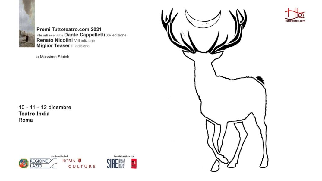 Da venerdì 10 a domenica 12 dicembre 2021 al Teatro India, l’Associazione Tuttoteatro.com presenta le finali dei Premi Tuttoteatro.com alle arti sceniche “Dante Cappelletti” e Miglior Teaser nonché l’assegnazione del “Renato Nicolini”. La manifestazione, ideata e diretta da Mariateresa Surianello, è realizzata con il contributo della Regione Lazio – Direzione Regionale Cultura e Politiche Giovanili. “Il progetto, promosso da Roma Culture, è vincitore dell’Avviso Pubblico Contemporaneamente Roma 2020-2021–2022 curato dal Dipartimento Attività Culturali ed è realizzato in collaborazione con SIAE” e con il Teatro di Roma – Teatro Nazionale.