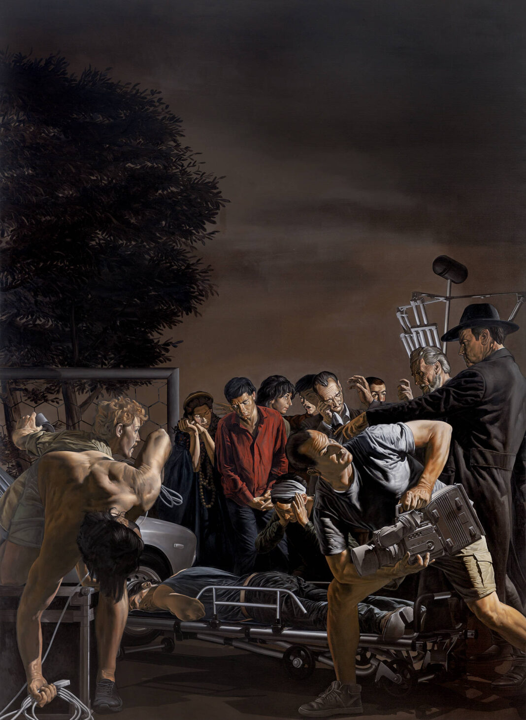 L’opera nasce dall’osservazione del drammaturgo Gian Maria Cervo dei dipinti di Nicola Verlato, pittore italiano neocaravaggesco considerato tra i massimi esponenti della cosiddetta lowbrow art, che lavora in un ampio spettro mediatico, dalla pittura alla scultura, dalla A.I. Art alla NFT Art. Nei suoi dipinti Verlato trasla la morte di Pasolini a un set di scenari storici idealmente “vicini”, come l’assassinio di Christopher Marlowe nel 1593, l’uccisione dei Gracchi a Roma nel II secolo avanti Cristo. A partire da questo Cervo ha sviluppato un’opera “di storia redentiva” in quattro quadri che trasforma i fatti attraverso strategie di emendamento della storia, verità estatica e fake provocatorio (reference per questo tipo di lavoro possono essere “Once Upon a Time in Hollywood” di Tarantino e “Death for Five Voices”, documentario di Werner Herzog). I quattro quadri sono ambientati a Deptford (Pasolini/Marlowe), Roma 1606 (Pasolini e Caravaggio), Roma 133-121 a.C. (Gracchi) e Roma 1975 con riferimenti a Ostia (nella data storica della morte di Pasolini ma in questa scena Pasolini vive).