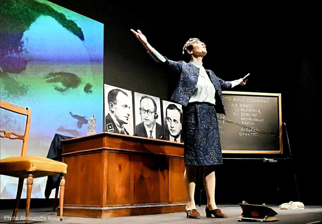 Le considerazioni tratte dal libro di Arendt sono proposte e restituite da Gualdo come l’argomento di una lezione frontale fatta da una professoressa a un classe scolastica. Gualdo entra in scena da una delle porte del teatro, scusandosi del ritardo, e sale sul palco dove campeggiano una cattedra e una lavagna trovando in questo modo l’interfaccia perfetta per restituire la sequela di dati e di considerazioni che Arendt fa nel suo libro al pubblico in sala.