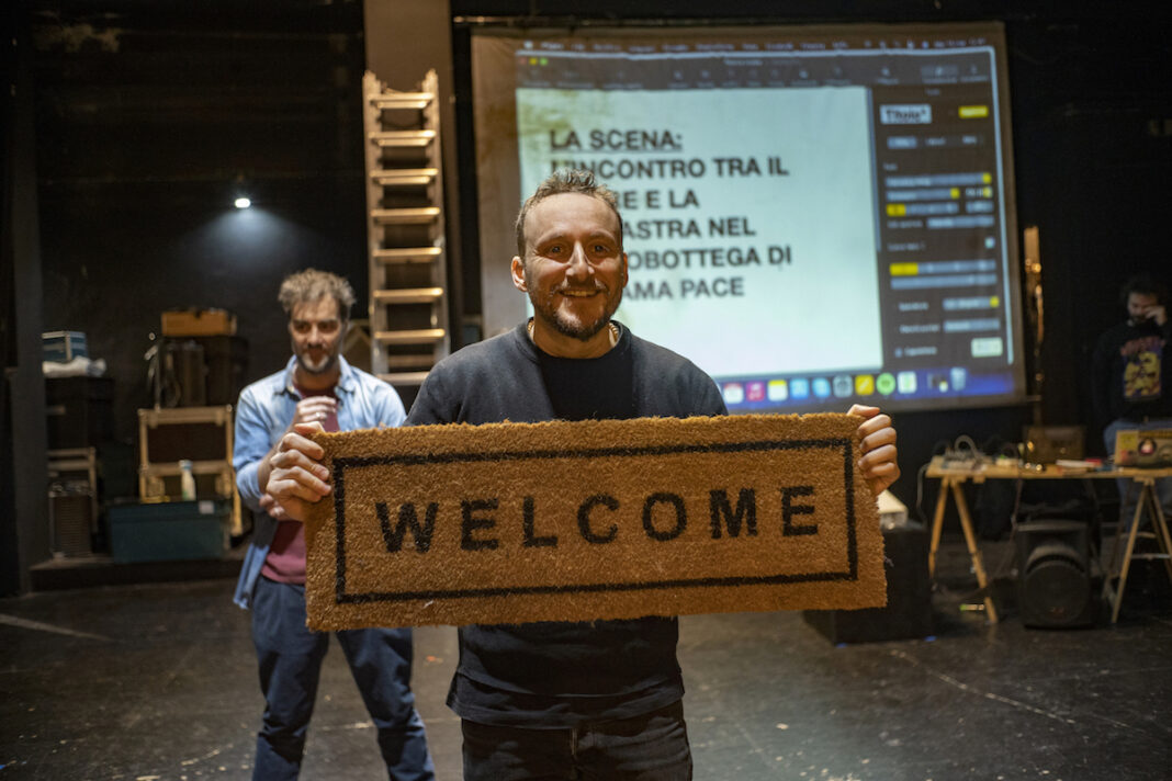 Il pubblico entra in sala mentre alcuni degli interpreti sono già in scena, uno allestisce una scarpa gigante, gli altri sono sul palco non si capisce bene a far cosa. C’è anche chi manovra un pc le cui immagini sono restituite da un videproiettore, proponendo alcuni brani musicali, e relative immagini video, come tappeto sonoro mentre la platea si riempie.