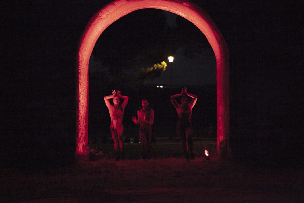 Poi finalmente guadagnano la scena, un grosso tappeto rosso realizzato con stoffe teatrali da Cosimo De Luca, unica distanza tra i loro corpi e il prato.