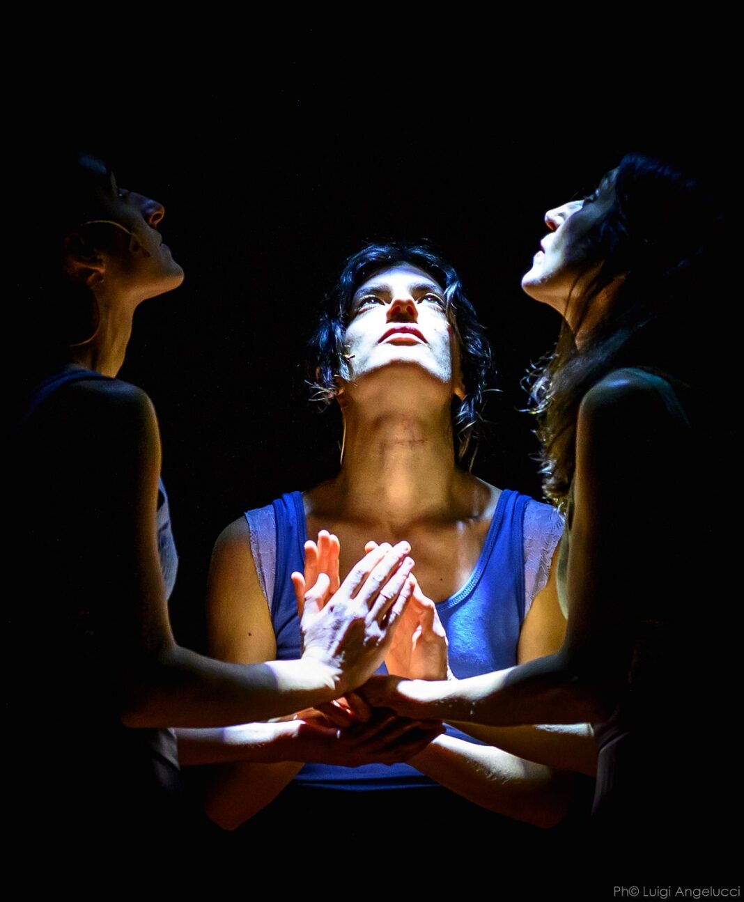 Anche l’uso dell’illuminazione, di Maria Elena Fusacchia, viene impiegato in maniera espressiva e drammaturgica, come quando, all’inizio, prima ancora che il testo venga proferito, nel buio della sala, un fascio di luce filiforme illumina solamente le mani delle tre interpreti, mani che prendono forma dentro il fascio muovendosi come forme fantasmatiche, stregonesche, dando alla presenza delle tre voci un’aurea atavica, primigenia quasi. Meno originale l’impiego della luce strozzo per restituire l’effetto ralentì di una caduta verso terra più cinematografico che teatrale.