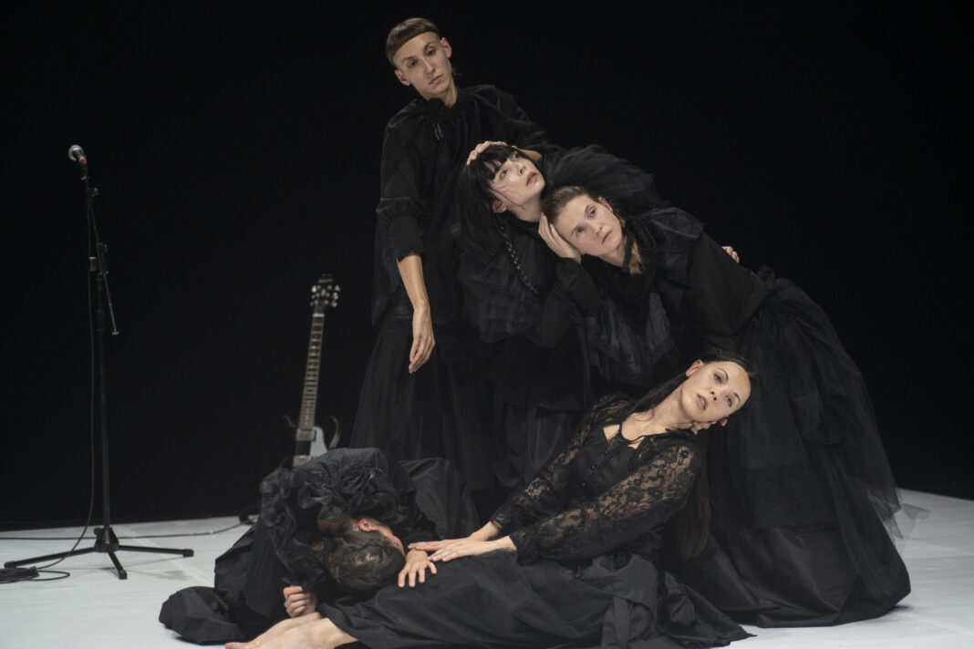 In scena, mentre il pubblico prende posto nel caldo cortile del teatro India di Roma, cinque donne, tutte di nero vestite, alcune col volto velato, una con un colletto che le disegna una cornice intorno al capo (a metà tra la gorgiera vittoriana e la rielaborazione del cappuccio di un mantello) sono o in posa ieratica, oppure accovacciate mormorando canzoni o litanie mentre maneggiano dell’acqua rituale da un catino bombato, anch’esso nero.