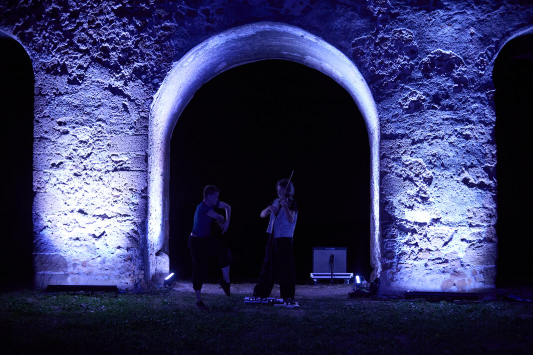 La location del parco di Torre del Fiscale con gli archi dei resti dell’acquedotto romano che si stagliano sullo sfondo del prato in cui la coreografia viene eseguita, costituisce un perfetto correlativo oggettivo alla performance: l’opera d’ingegno della musica e della coreografia contemporanee si riflette nell’architettura antica in un dialogo continuo che echeggia suggestioni sotterranee eppure concrete.