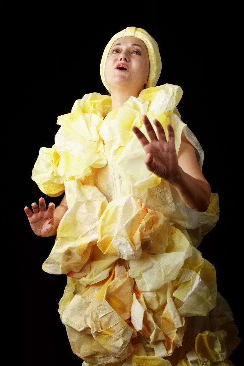 In scena un velo nero copre un oggetto ovale. Sarà una gabbia o qualche altro strano strumento? A sinistra si intuisce un corpo rannicchiato sotto un telo verde petrolio. Pannelli neri fanno da sfondo. Le luci si abbassano e dal telo verde esce un verme bianco dalle fattezze di un tubo pieghevole. Racconta il suo rapporto di parassitismo con quel corpo ancora velato, fino a quando finalmente si scoprirà del tutto e inizierà un gioco dialettico tra i due. Intanto, anche il velo nero sull’ovale è sparito e al suo posto è apparso un grande uovo bianco, il simbolo per eccellenza della riproduzione.