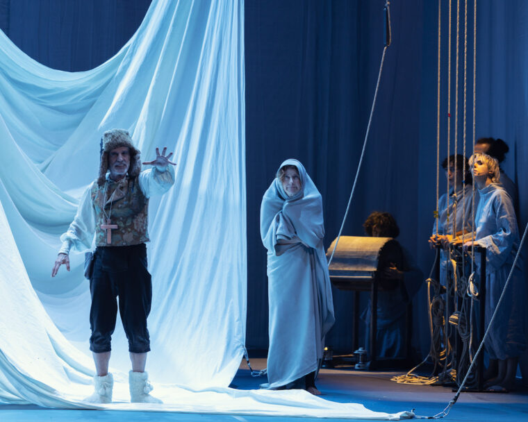Le onde del mare sono rese con un enorme telo manovrato dai e dalle sette performer che, di volta in volta impersonificano marinai, scienziati e scienziate, o restituiscono la presenza fantasmatica del calamaro gigante (anche tramite le ombre cinesi abilmente proiettate sullo sfondo di quinta). Una scena spoglia, tranne delle sartie ai lati del palco, che evocano le navi a vela d’altri tempi, che esiste solamente grazie all’azione scenica – e alle luci – secondo una tradizione artigianale del teatro magnificamente eseguita e che manca a teatro da tanto tempo. Una scenografia (di Anna Varaldo) che usa elementi mobili per evocare ambienti e situazioni mentre il palco, ricoperto i quinta da dei teli, si colora grazie a un uso accorto delle luci (di Gaetano La Mela), ora di blu come l’oceano ora di bianchi come la neve del nord…