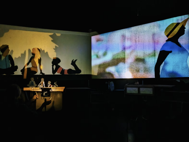 Questo racconto delicato e tenue tenuto sul filo della memoria con parole calme e misurate viene dipanato attraverso la musica e il canto eseguiti dal vivo (la voce di Babeth è incarnata dalla musicista Jina di Najma), l’impiego di reperti audio dai notiziari tv e radio dell’epoca e attraverso l’uso di immagini che costituiscono un commento visivo al racconto di Babeth. Queste immagini e questi suoni sono affiancati da un impianto scenografico fatto di proiezioni da teatro d’ombre.